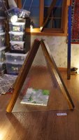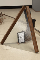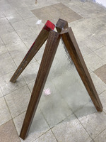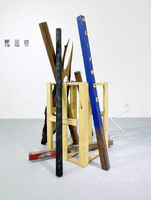 More Big ILLEONG ‘More Big ILLEONG’ is a work produced in 2019. Wooden beams lean against each other in a triangular formation, with patterned glass attached to one side. One of the beams bears a paper sticker indicating its standard dimensions, over which red and white spray paint has been applied. A bell-shaped form is placed at the base of the beams. -