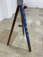 A Little More ILLEONG ‘A Little More ILLEONG’ is a work produced in 2019. Three wooden beams lean against one another in a triangular formation. One of the beams is sprayed with blue paint and has yellow three-dimensional letters spelling ‘OLLINGE’ attached to it. At the vertex where the three beams meet, a smartphone device is suspended by thread, through which a video is displayed. -