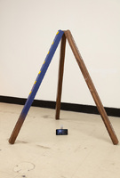 Photograph of ‘Visage’ by Daul RHEEM exhibited in ‘Crown Shyness’ at the Korea National University of Arts from December 21, 2020, to January 21, 2021 This is a Photograph of ‘Visage’ by Daul RHEEM exhibited in ‘Crown Shyness’ at the Korea National University of Arts from December 21, 2020, to January 21, 2021. The file size is 225 KB, and the format is JPG. It features wooden square timbers leaning in a triangular form; one is painted blue with ‘OLLINGE’ letters attached. Another has a label indicating the wood type (WALNUT) and original size. A smartphone device is suspended by thread at the meeting point of the three timbers, playing a video. -