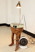 Photograph of ‘Ankle’ by Daul RHEEM exhibited in ‘Crown Shyness’ at the Korea National University of Arts from December 21, 2020, to January 21, 2021 This is a Photograph of ‘Ankle’ by Daul RHEEM exhibited in ‘Crown Shyness’ at the Korea National University of Arts from December 21, 2020, to January 21, 2021. The file size is 225 KB, and the format is JPG. It features a fish tank placed on a wooden sculpture, containing a water motor and shrimp-shaped silicone bait. A light is installed above to illuminate the tank. -