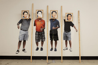 Photograph of ‘Heart’ by Daul RHEEM exhibited in ‘Crown Shyness’ at the Korea National University of Arts from December 21, 2020, to January 21, 2021 This is a Photograph of ‘Heart’ by Daul RHEEM exhibited in ‘Crown Shyness’ at the Korea National University of Arts from December 21, 2020, to January 21, 2021. The file size is 236 KB, and the format is JPG. It features digital prints of a person's body overlaid with various edited facial images using wooden frames at regular intervals, with wooden timber leaning between the figures. -