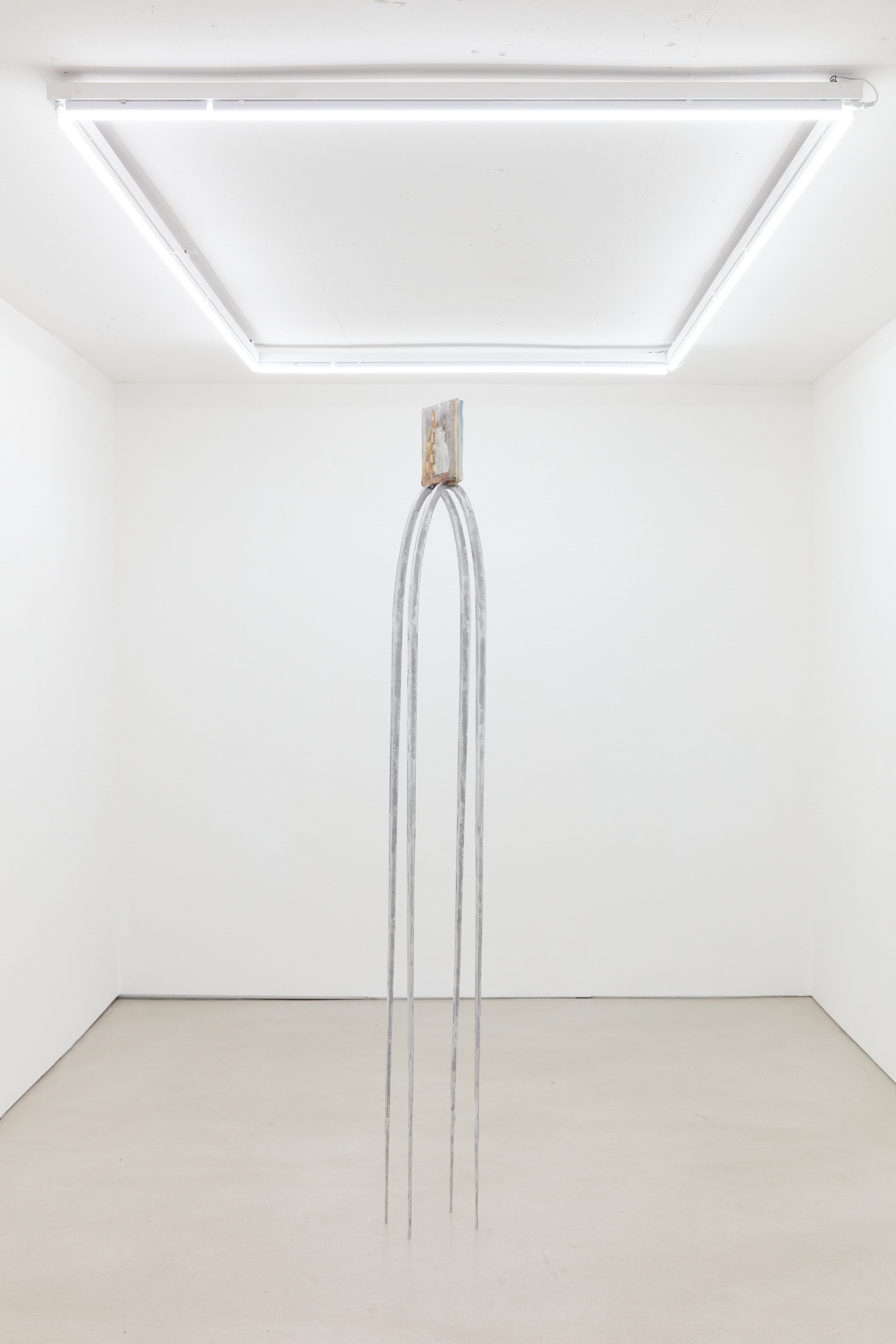 This installation work was presented in “Rheem, Daul”, held at sangheeut from August 23 to September 22, 2024. In the middle of the exhibition, the fabric covering the metal support was replaced, resulting in at least two distinct appearances. Each side of the fabric is printed with a different image, both depicting fish. The double-sided printed fabric is designed to be joined with a zipper closure.