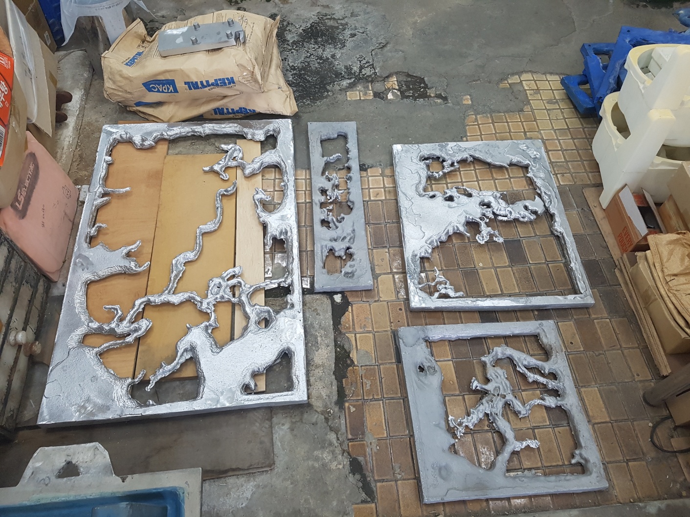 This installation work was presented in “Rheem, Daul”, held at sangheeut from August 23 to September 22, 2024. In the middle of the exhibition, the fabric covering the metal support was replaced, resulting in at least two distinct appearances. Each side of the fabric is printed with a different image, both depicting fish. The double-sided printed fabric is designed to be joined with a zipper closure.